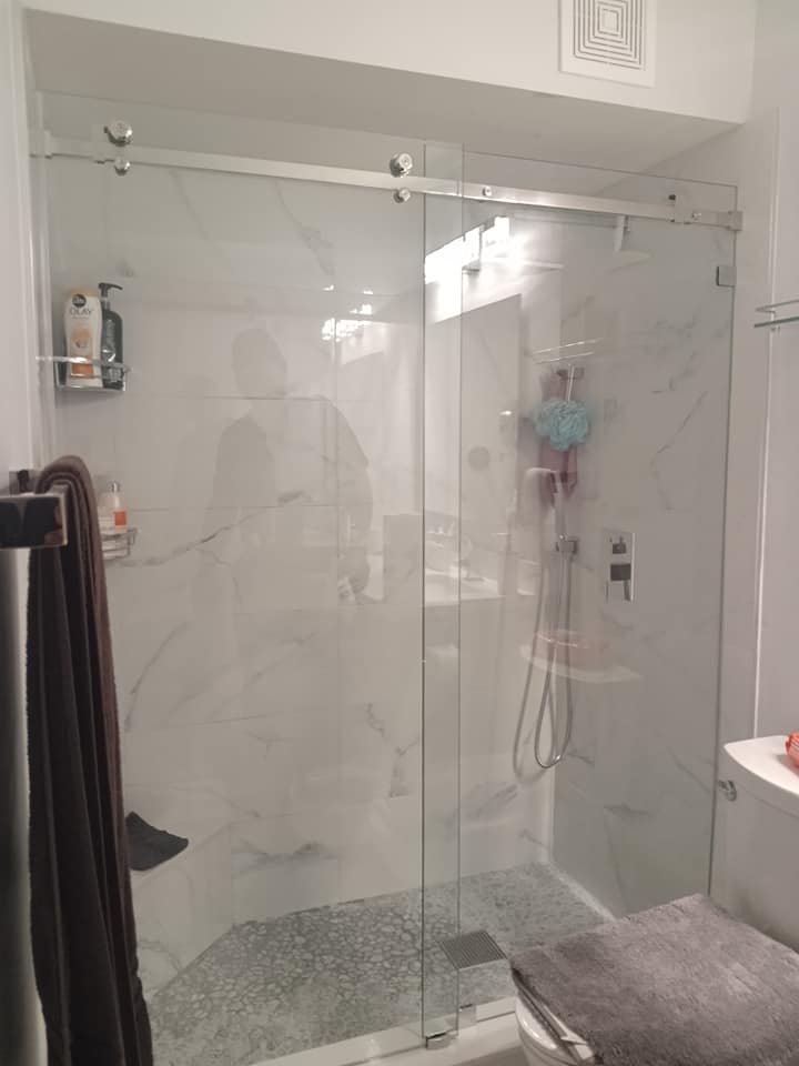 Frameless sliding door with certified tempered glass 3/8 in and stainless steel hardware chrome finish. The project was done in Miami Springs