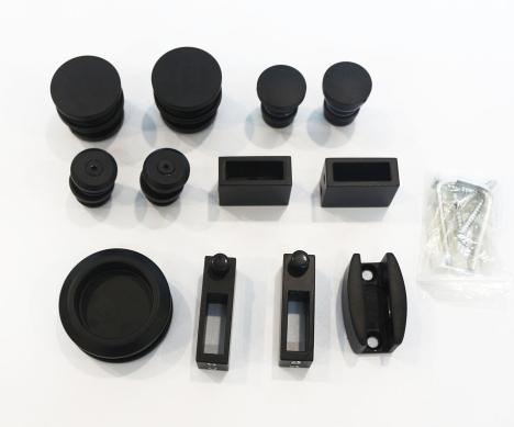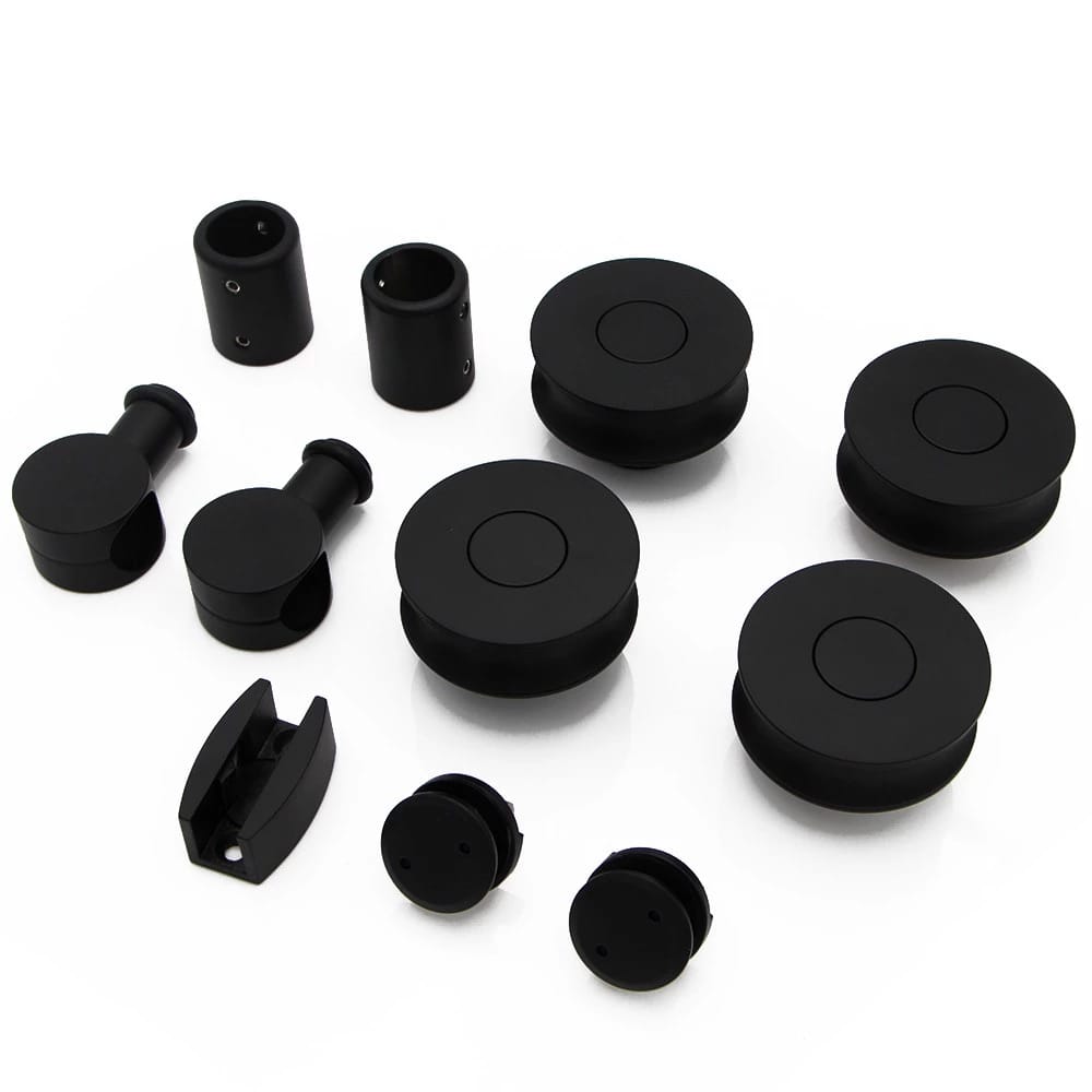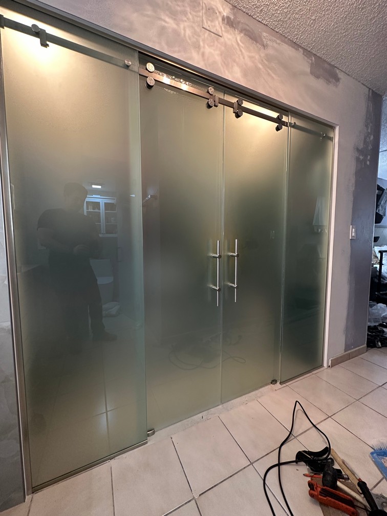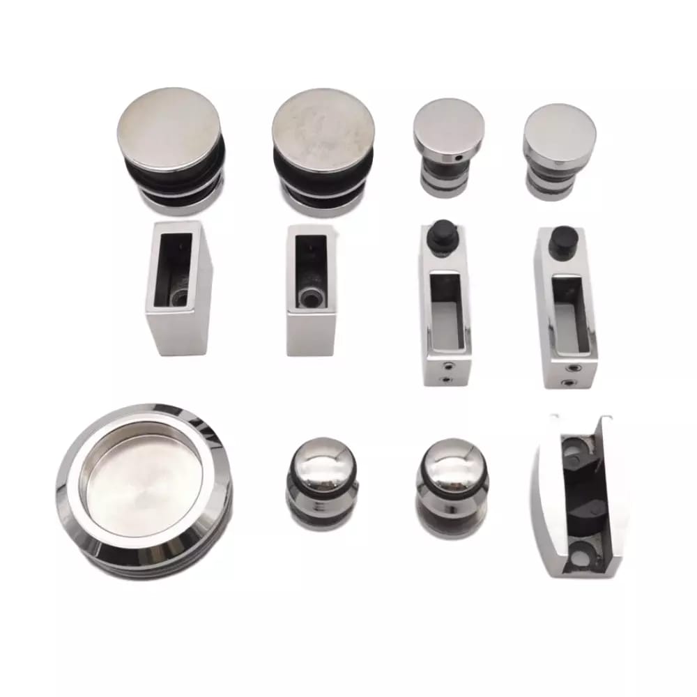 Normally we use tempered clear safety glass 3/8 inches with stainless steel metal with different glass hardware finish like chrome, brushed nickel, gold, black matt. The 4 wheel rooling system provides an extra strengh for the entire system and is a valuable investment since it will provide a solid estructure and balance and more adjustement for the door.